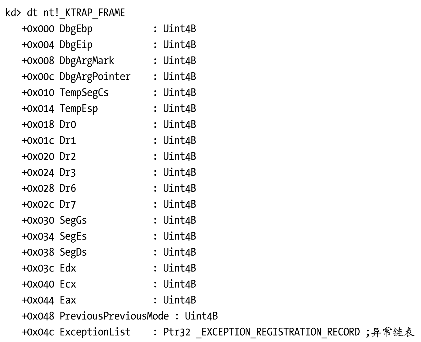 所有的门例程中都使用陷阱框架KTRAP_FRAME,而不是KINTERRUP_FRAME(未定义),KTRAP_FRAME的主要作用是在进入中断例程时保存寄存器,退出时还原寄存器。它能保存大部分CPU寄存器,如通用寄存器、段寄存器、调试寄存器等,对于中断处理例程来说够用了。KTRAP_FRAME结构中寄存器的值在门例程内部是可以根据需求改变的。最常见的是KTRAP_FRAME.Eip的值被修改,如果异常未被处理,返回的是原来出错的位置,进一步执行又产生中断,再次循环进入门例程。如果内核在调试状态,就会中断下来。如果内核不在调试状态,就会显示蓝屏出错信息。