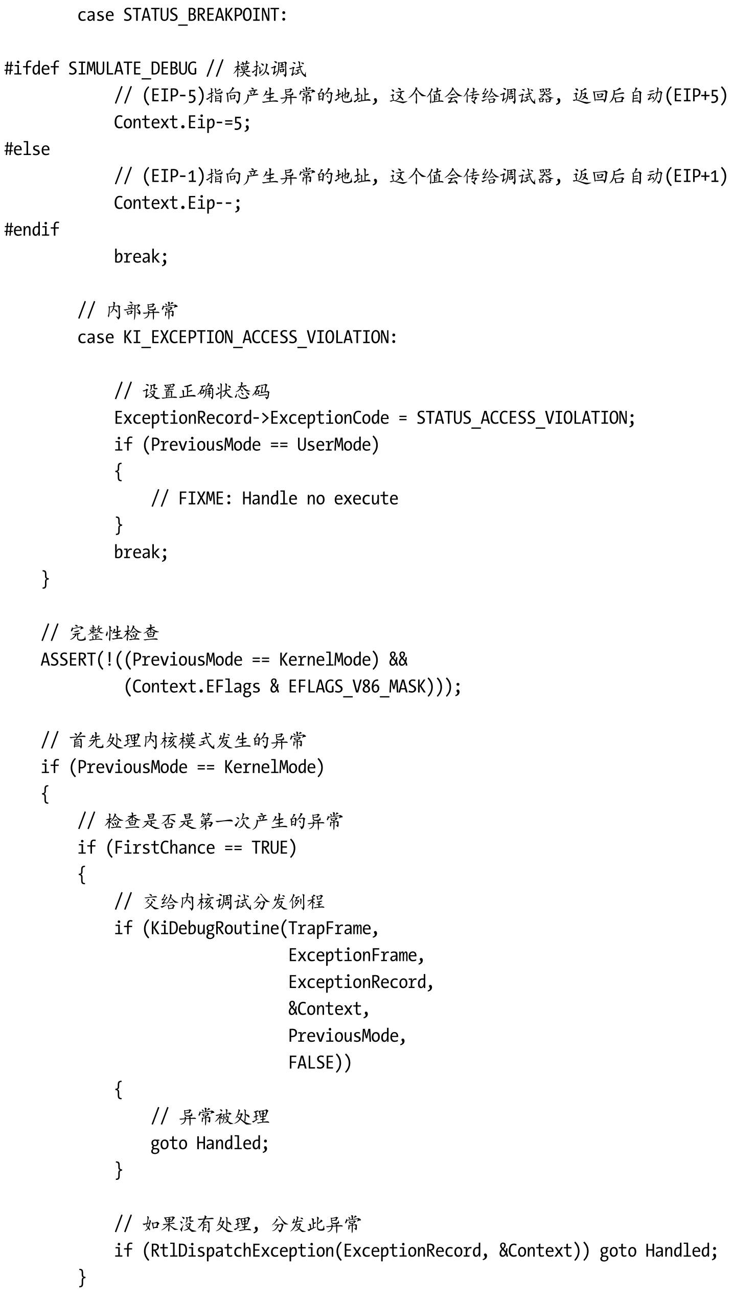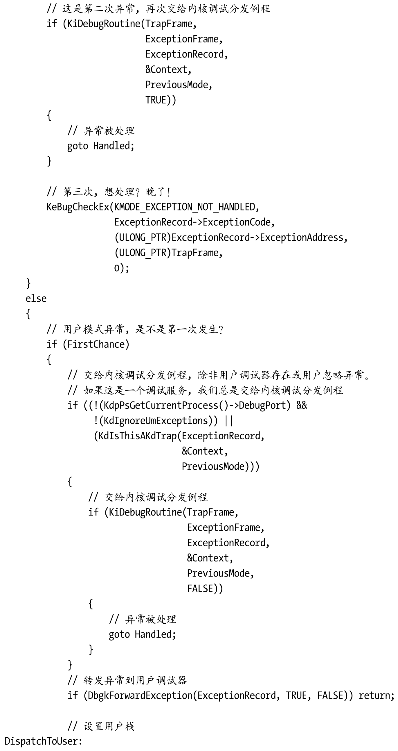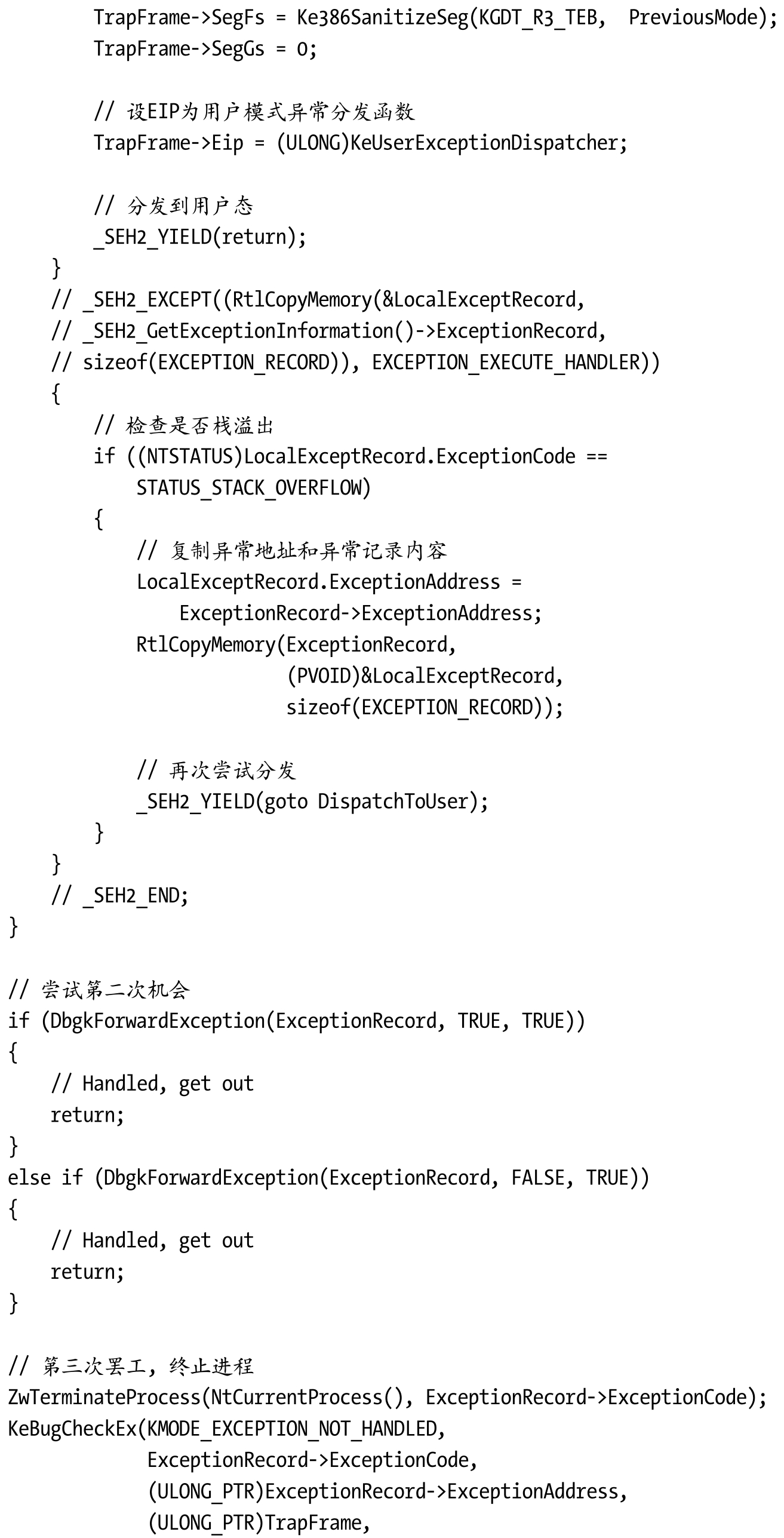 对于内核态产生的异常(PreviousMode=KernelMode),第一次机会(FirstChance=TRUE)交给内核调试分发函数KdpTrap。KiDebugRoutine是全局函数指针,在KdpInitSystem函数初始化时指向KdpTrap,可见调试器拥有最先处理异常的能力。如果调试器不处理此异常,异常返回后交给RtlDispatchException函数处理,给异常修正的机会,异常被恢复后还能正常执行,RtlDispatchException也依赖try/catch代码块在编译时产生的异常栈框架(参阅第5章)。如果异常在RtlDispatchException函数中处理失败,异常再次交给内核调试分发函数KdpTrap,如果这次调试器也不能处理,它就会调用KeBugCheckEx使系统崩溃。