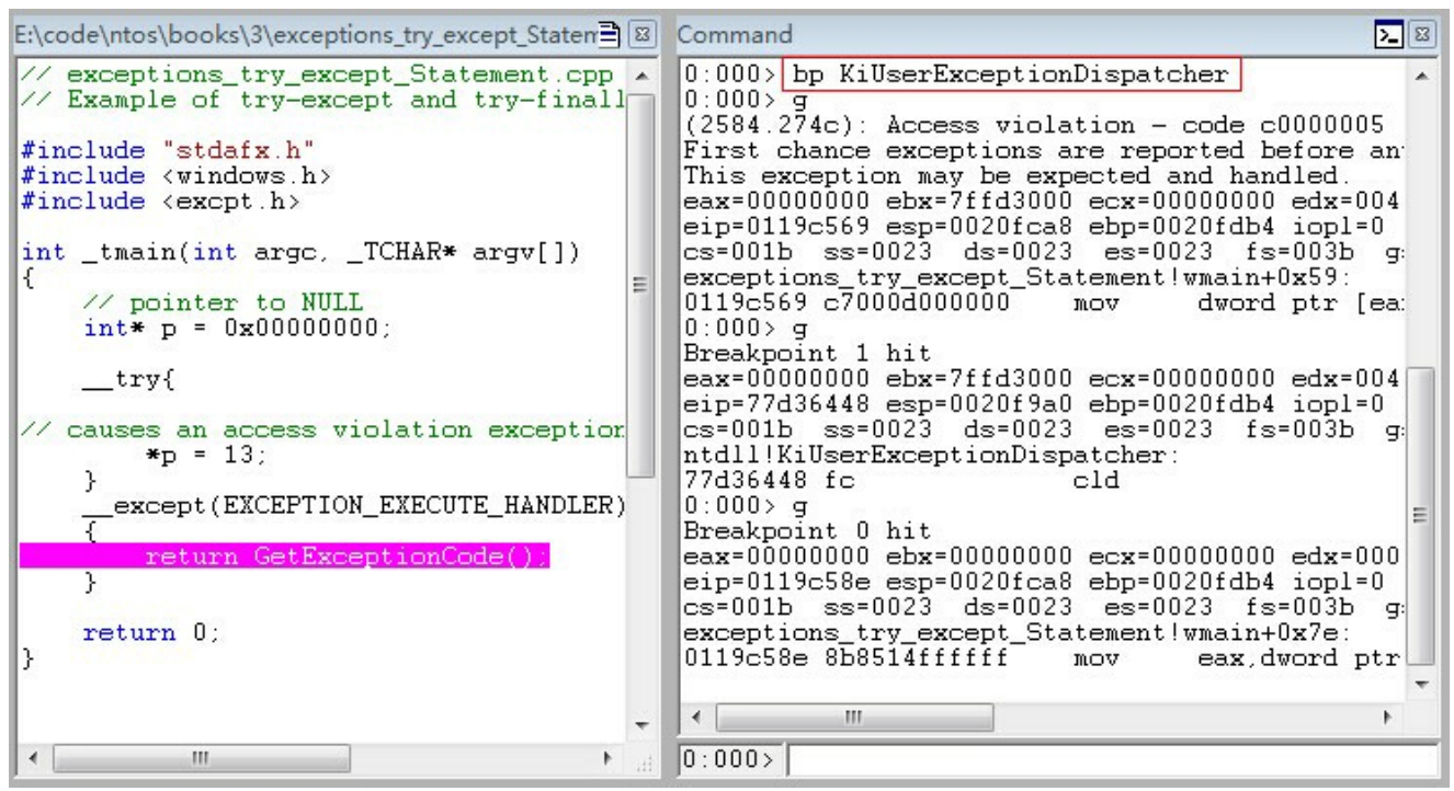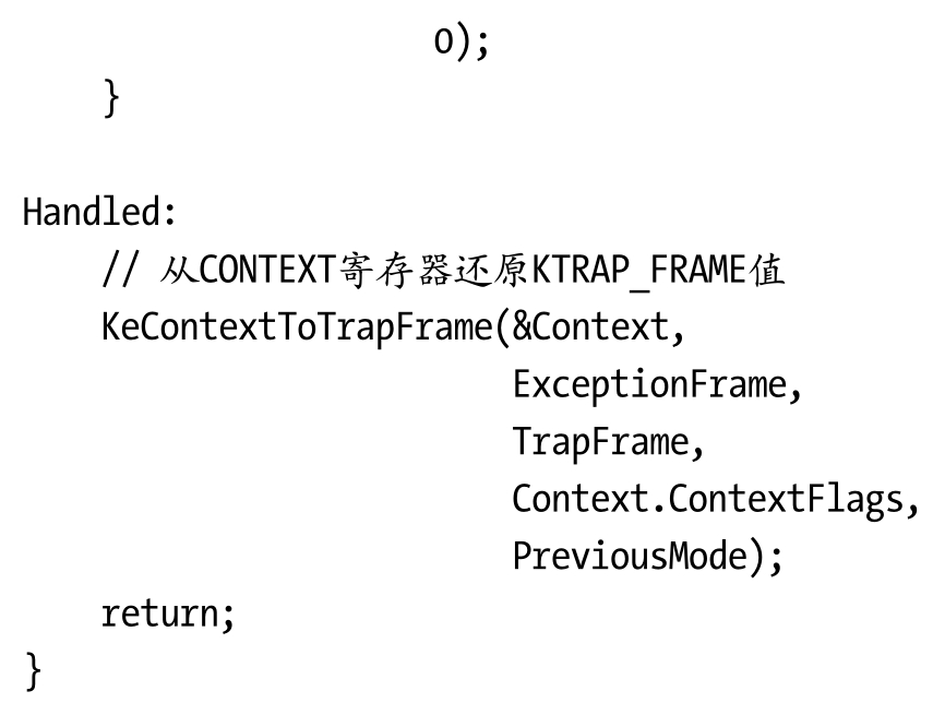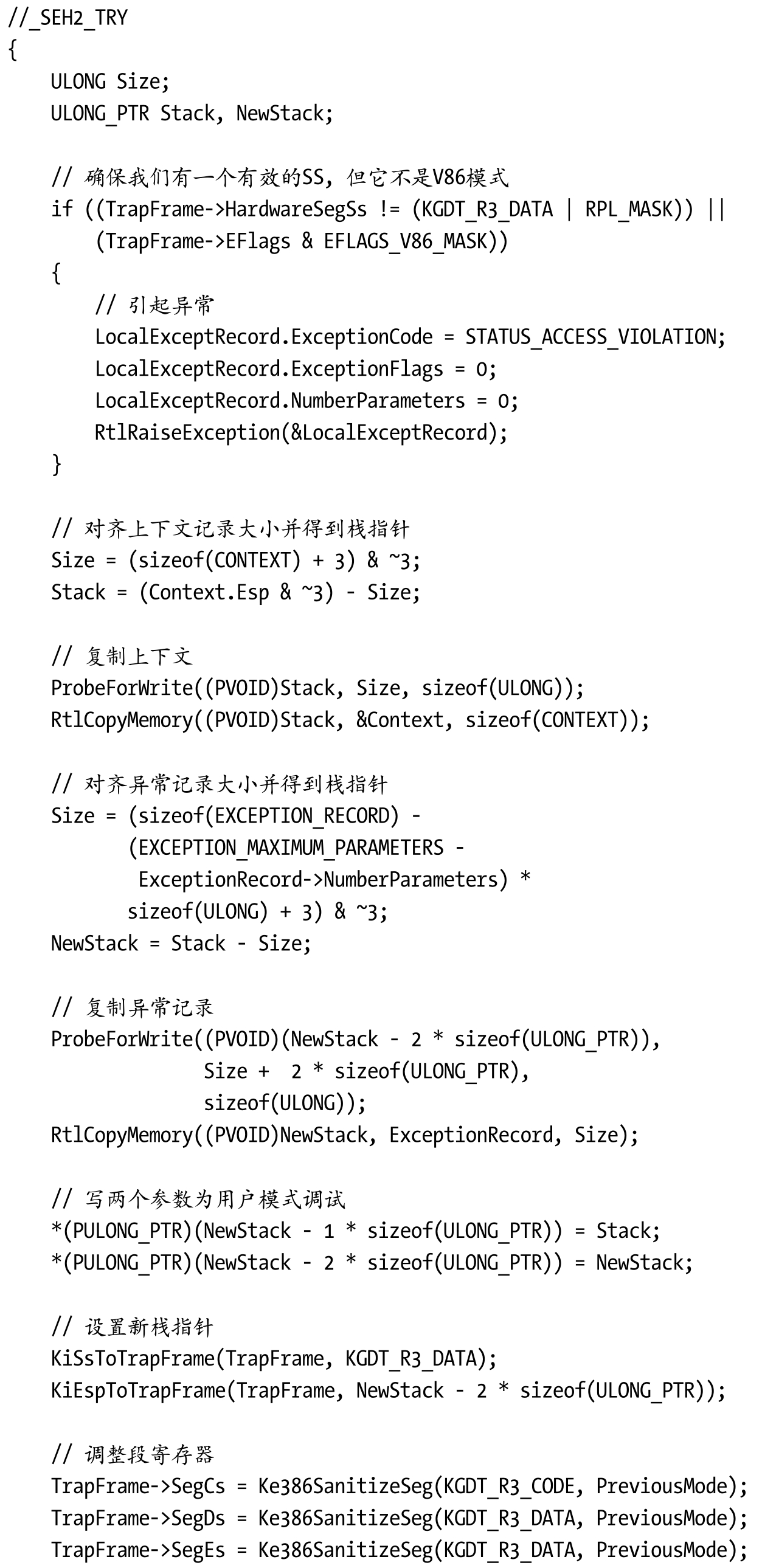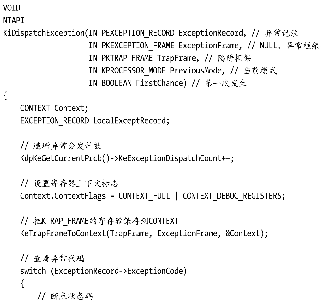 当异常发生时,中断异常处理程序得到控制权,并在一个寄存器上下文KTRAP_FRAME保存了寄存器的状态,在EXCEPTION_RECORD结构中描述了异常相关的参数,然后调用KiDispatchException函数分发异常。此函数把异常分发到内核模式(KernelMode)或用户模式(UserMode)相应的例程中去处理。如果当前模式是内核模式,该异常被直接处理;如果当前模式是用户模式,陷阱框架和异常记录的内容会被复制到用户栈,控制权转回给用户后执行用户态异常处理程序。