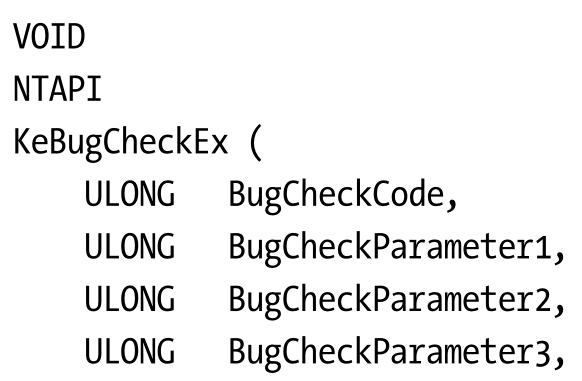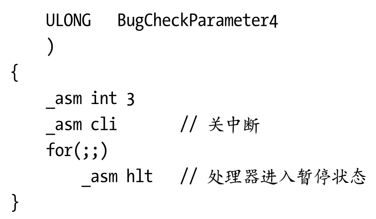 调试系统的KeBugCheckEx函数并不显示真正的蓝屏代码,它只是循环在那里,这也算是一个崩溃函数。当然如果真运行到这里,我们希望调试器得到通知,所以顺便加了断点代码,KeBugCheckEx函数的完整实现请查看ntoskrnl内核模块代码。它们是不同的函数,调用的入口不同。如果内核下真有不可预料的情况发生,调用KeBugCheckEx就会显示崩溃信息。