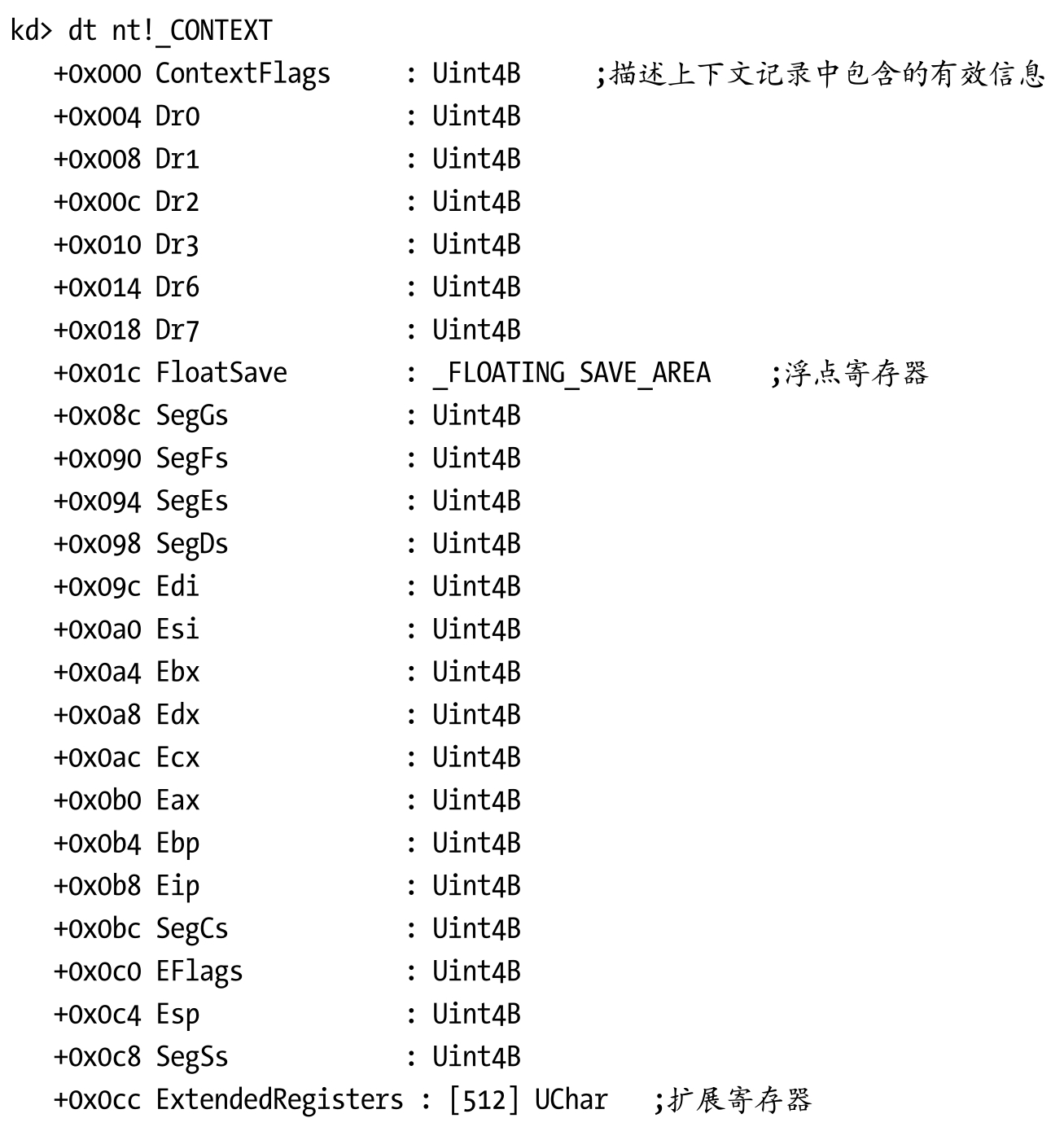 CONTEXT上下文记录保存完整寄存器信息,部分是从KTRAP_FRAME复制来的。上下文记录描述了在发生异常时的机器状态。这个记录与硬件体系结构相关,是不可移植的。因此,在一般情况下,软件不应该使用该记录包含的信息。但与硬件体系结构相关的代码,如数学库,可以利用这些信息来优化某些操作。对于硬件触发的异常,上下文会记录在异常发生时机器的完整状态。对于一个软件触发的异常,上下文只会记录异常发生那一刻机器的状态。