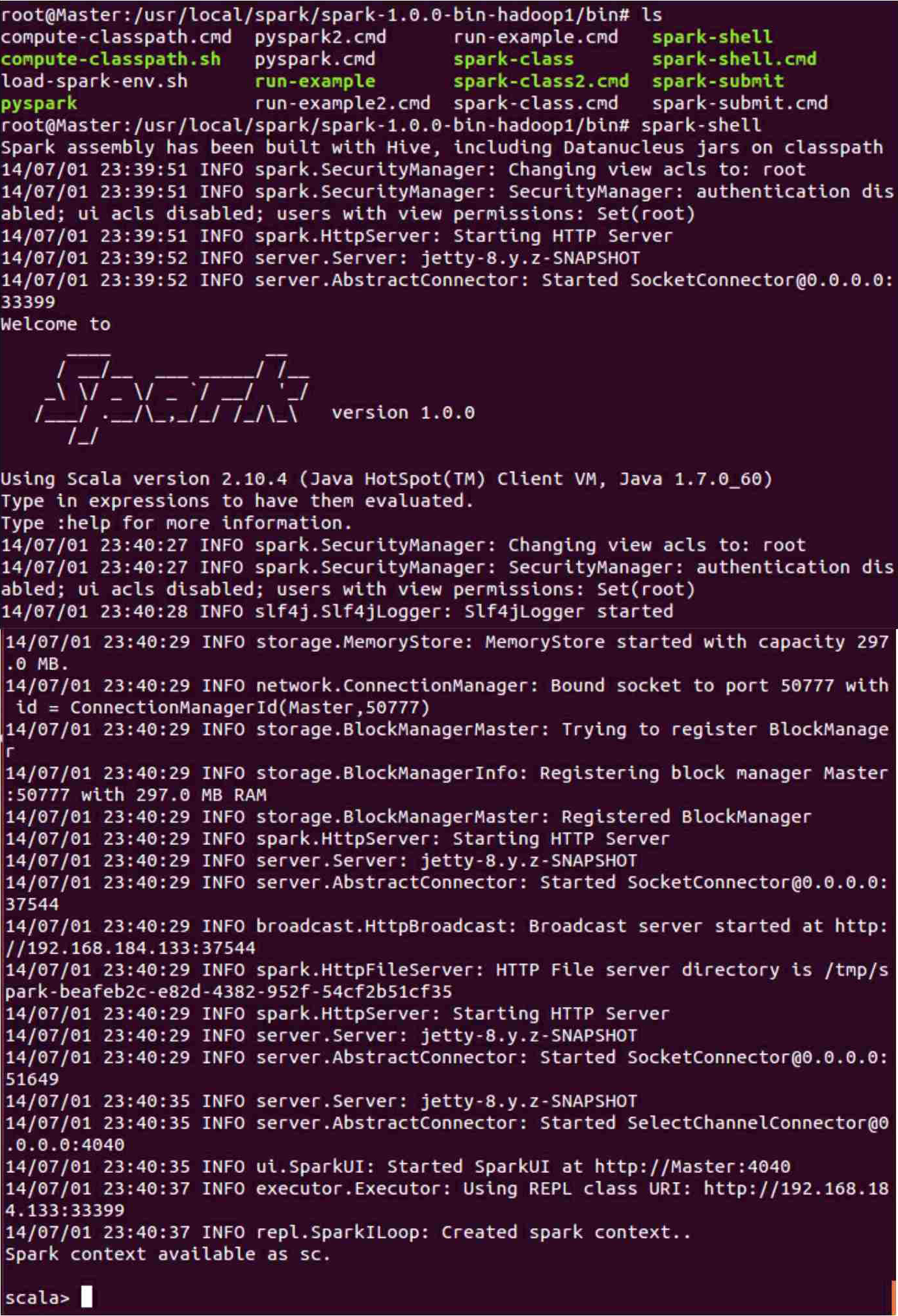 此时,进入Spark的bin目录,使用“spark-shell”控制台:
