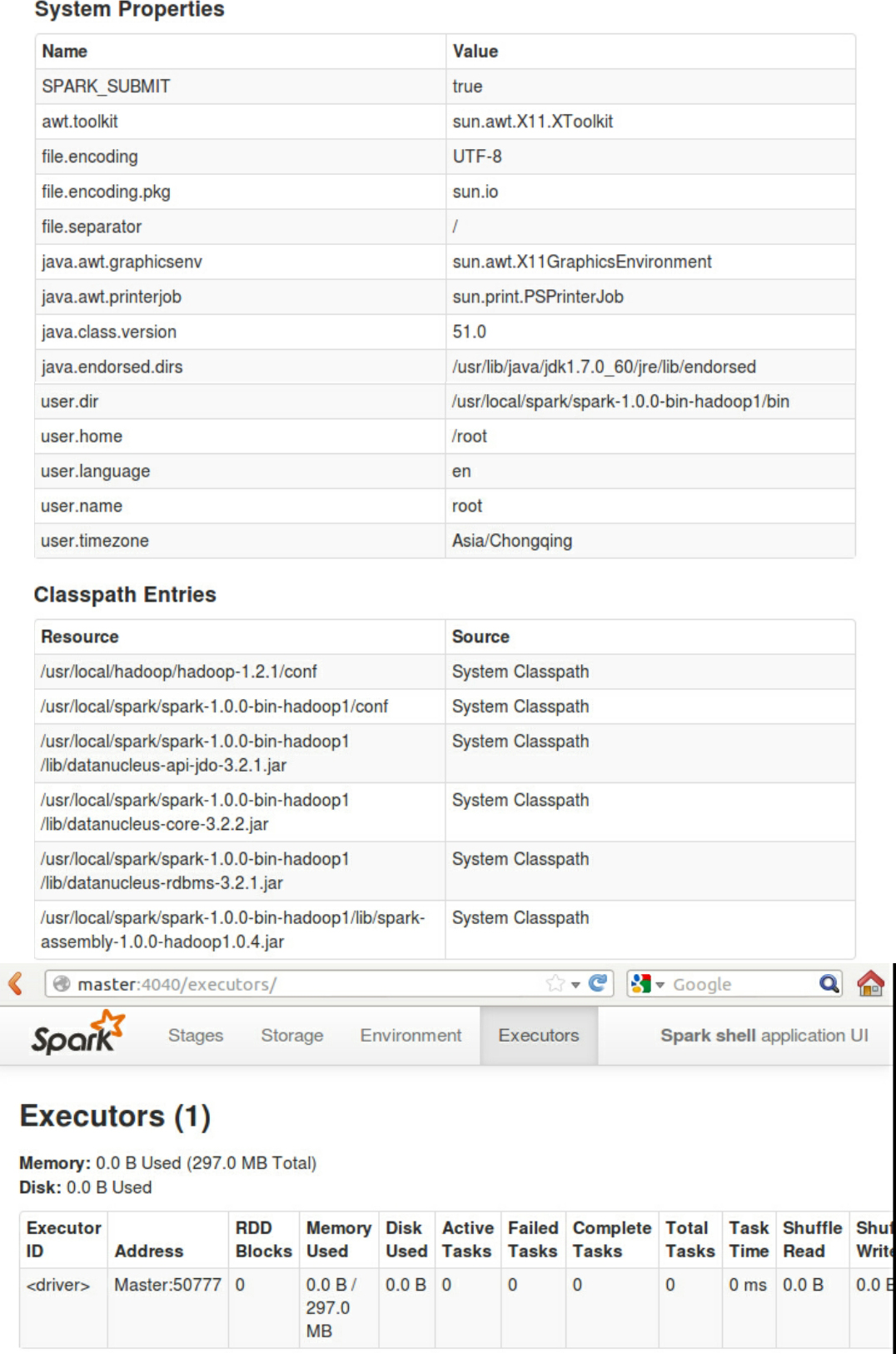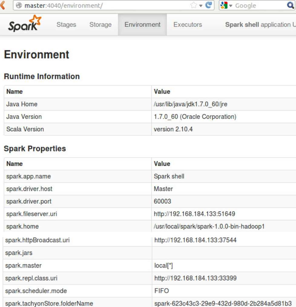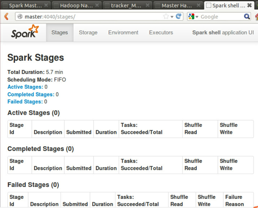 此时进入了Spark的shell世界,根据输出的提示信息,可以通过“http://Master:4040”从Web的角度看一下SparkUI的情况,如图2-53所示。