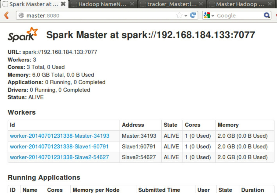 此时,可以进入Spark集群的Web页面,访问“http://Master:8080”,如图2-52所示。