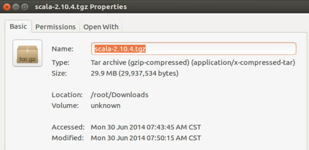 笔者下载的是“Sala 2.10.4”,具体官方下载地址为http://www.scala-lang.org/download/2.10.4.html,下载后在Master节点上保存位置,如图2-50所示。