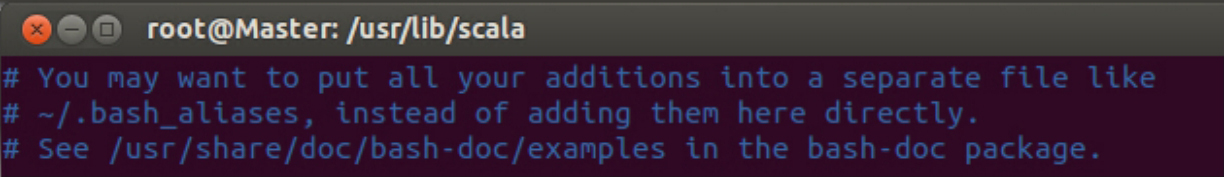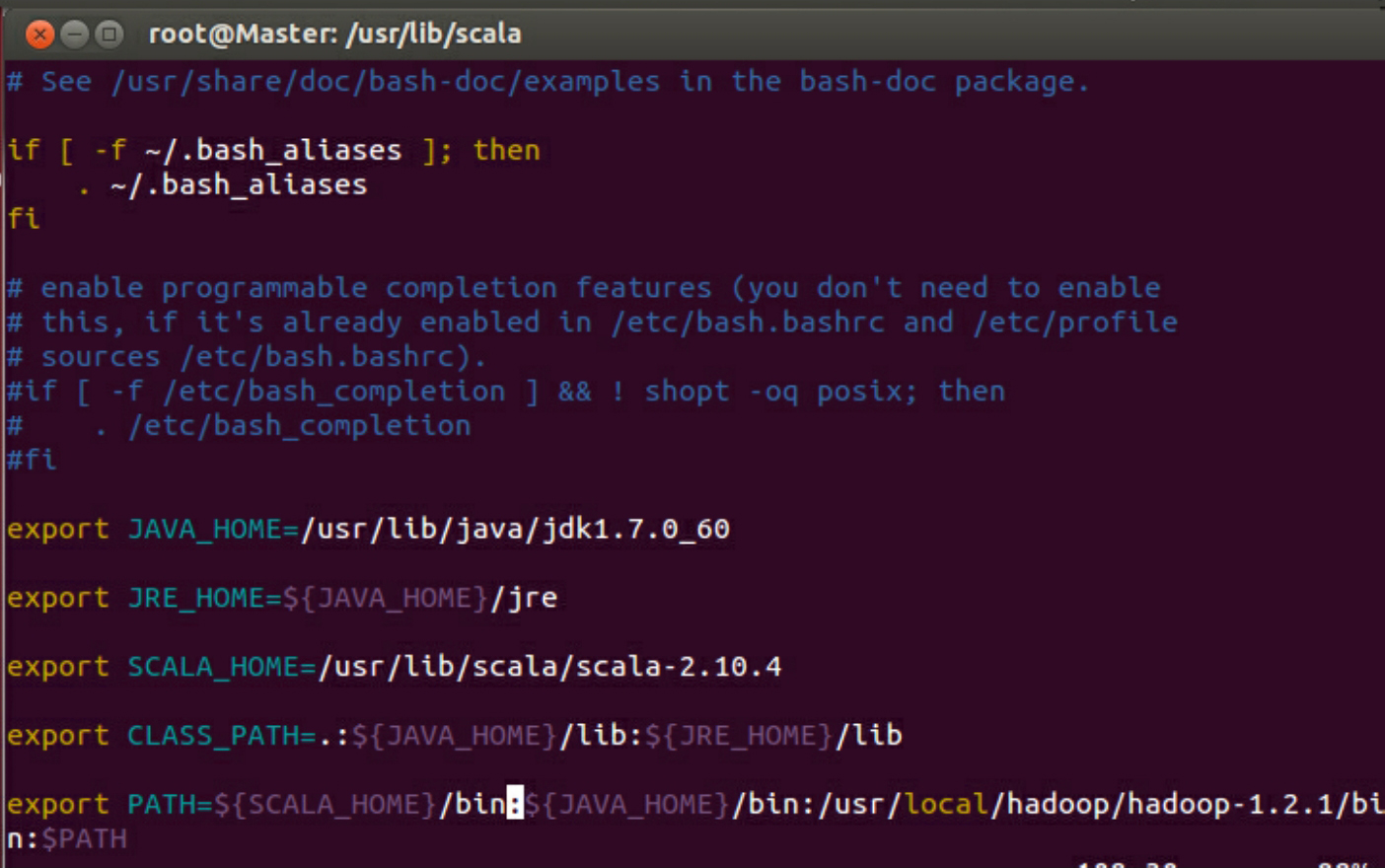 从配置文件中可以看出,设置了“SCALA_HOME”并把Scala的bin目录设置到了PATH中。按下“esc“键回到正常模式,保存并退出配置文件: