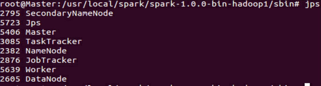 此时使用jps可发现我们在主节点正如预期一样出现了“Master”和“Worker”两个新进程!