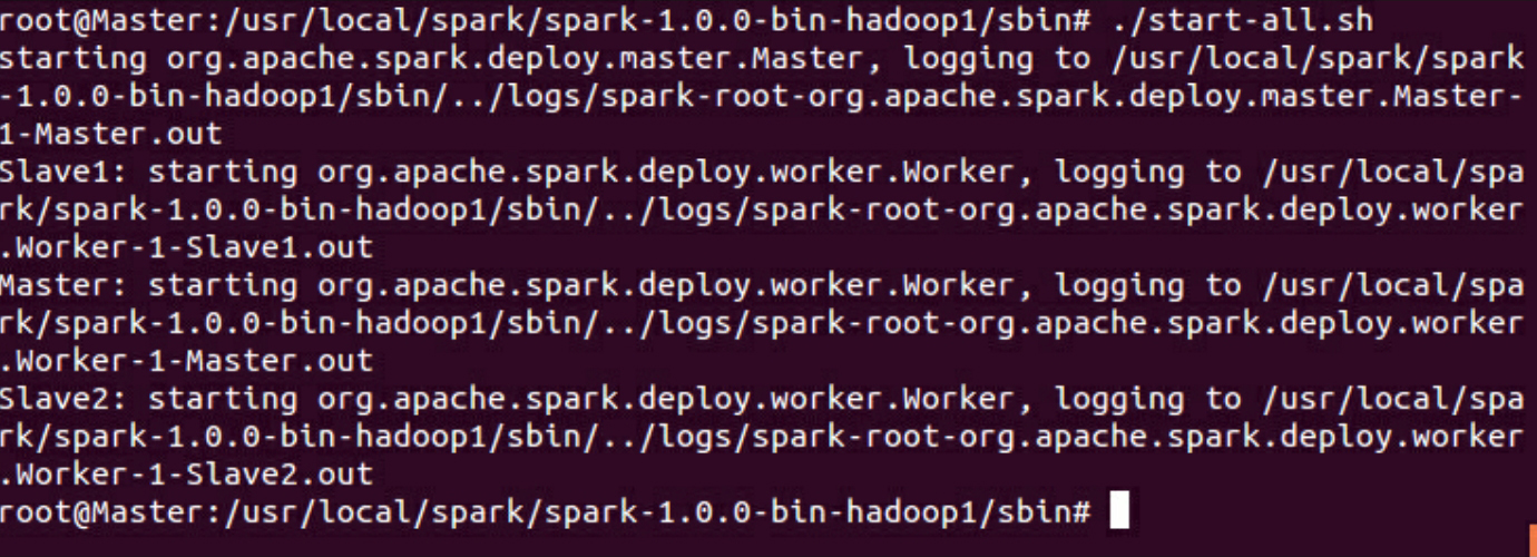 在Hadoop集群成功启动的基础上,启动Spark集群需要使用Spark的sbin目录下“start-all.sh”: