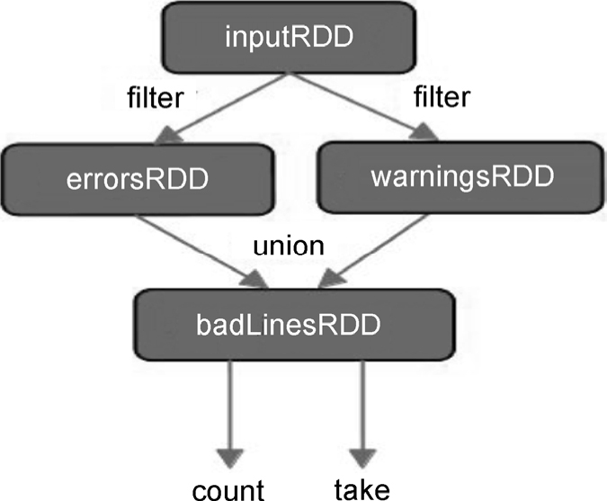 我们可能想打印出一些关于badLinesRDD的信息。为了做到这一点,我们使用两个动作,count(),它返回计数,为一个数字;take()包含了大量来自RDD的元素。