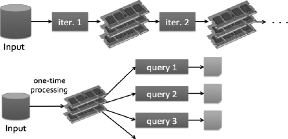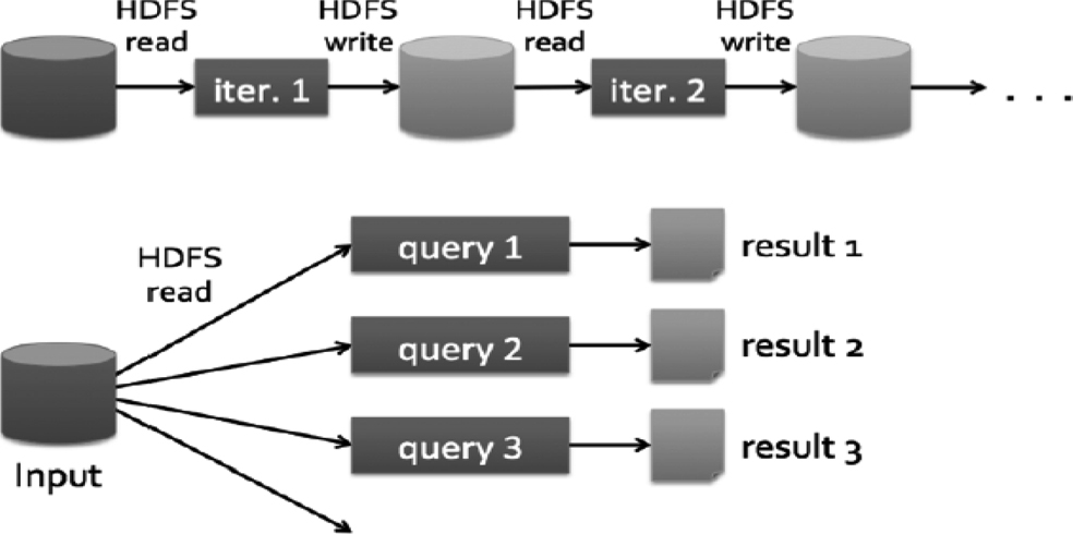 MapReduce在每次执行时都要从磁盘读数据,计算完毕后都要把数据存放到磁盘上,如图1-25所示。