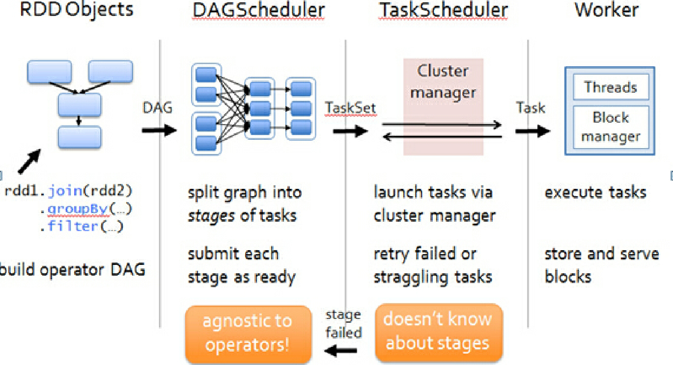 基于DAG,Spark具备了非常精致的作业调度系统,如图1-28所示。