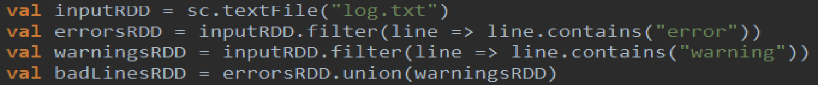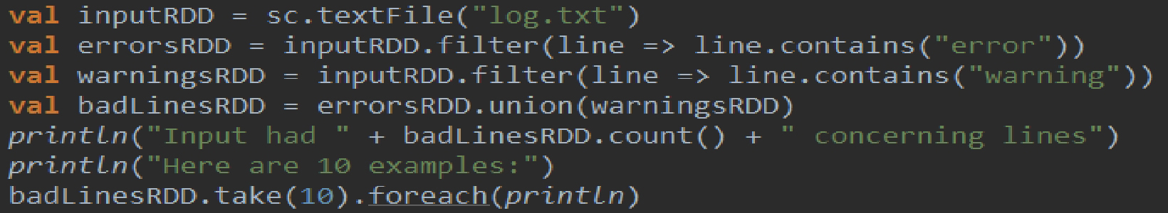注意,filter()的操作不改变现有的inputRDD。相反,它返回一个全新的RDD。inputRDD仍可以在以后的程序重新使用,例如,要搜索“error”以外的其他词语,使用inputRDD再次搜索含有“warning”的行,然后使用另一种转型union(),打印出含有“error”或“warning”的行。例子如下: