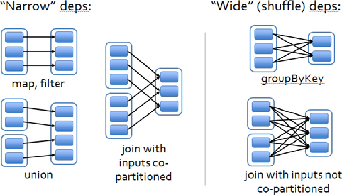 DAG中的依赖有宽依赖和窄依赖之分,如图1-29所示。