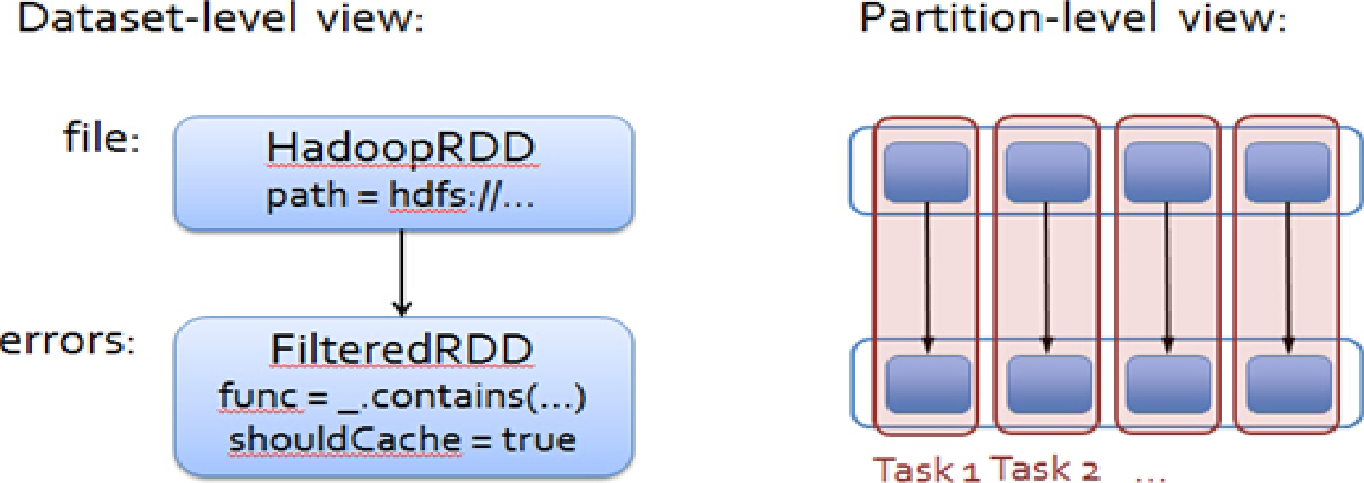 图1-33给出了血统图的例子,包括inputRDD和结束的两个动作。需要注意的是,每次我们调用一个新的动作,整个RDD必须“从头开始”计算。为了提高效率,用户可以将这些中间结果持久化。