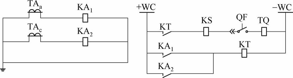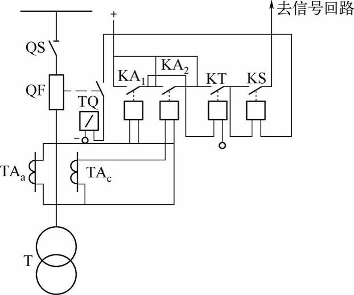 变压器过流保护整体式原理接线图如图1-2所示。该图中的二次设备有两相电流互感器TA a 、TA c ,两相电流继电器KA 1 、KA 2 和时间继电器KT,还有一个信号继电器KS。
