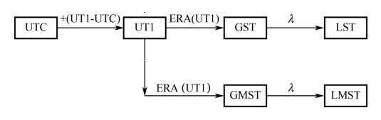这里“格林尼治”的确切含义应该是指包含地心、天球中间极CIP以及地球中间零点TIO的平面。CIP可以认为是地球自转轴(等价于真天极),其位置由岁差—章动模型决定;而TIO可以认为是在中间赤道上,固定于经度为0度的点。严格地说,TIO的位置与极移有关,而经度λ应该是从TIO起量,然后再利用λ计算当地的真恒星时(LST)和平恒星时(LMST)。