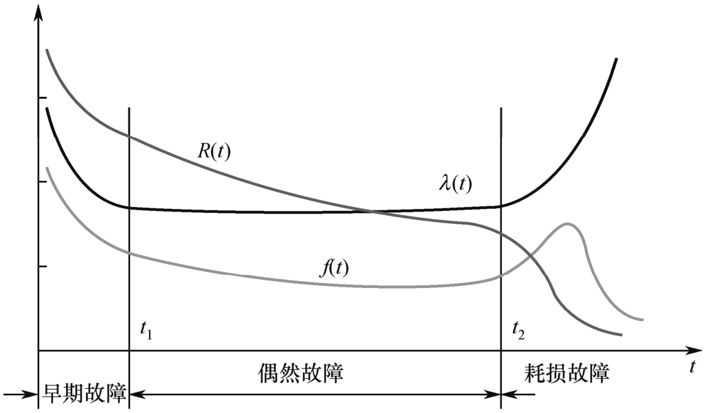 图中,时间t 1 和t 2 把曲线分成三段。第一段和第三段失效率λ(t)高、第二段失效率λ(t)低,整个失效率λ(t)随时间t的变化形如浴盆,也称浴盆曲线。