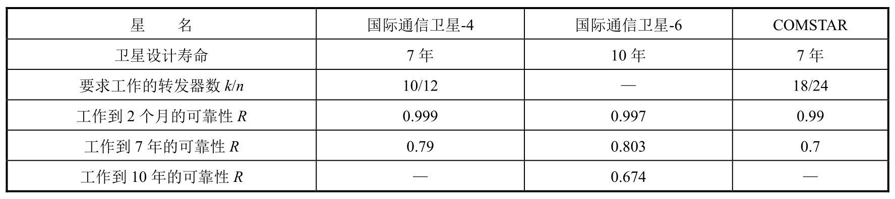 在静止轨道通信卫星设计中,用可靠性表示法是给出卫星进入静止轨道定点位置后从开始工作到寿命结束整个寿命时间段内n个转发器中k个能正常工作的随时间变化的概率。在对外的技术文件中,一般只给出特征值:一个是初期工作的可靠性。另—个是寿命末期的可靠性。例如国际通信卫星和美国的国内通信卫星COMSTAR等卫星都用这种方法表示的,其数值如表5-12所示。