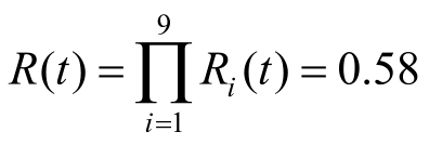 现假设各分系统相互独立,且任一个分系统失效就会导致整星功能失效。因此,其故障模式属串联型可靠性系统。应用公式5-31可计算得整星在设计寿命为五年末期可靠性如下: