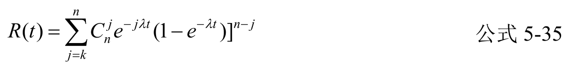 设一系统有n个相互独立具有相同可靠性函数R i (t)的部件组成。设此系统n个部件中至少有k个部件工作正常,系统才算工作正常;即当失效的部件数≤n-k时,系统工作正常,当失效的部件数>n-k 时,系统失效,此系统我们称它为 k-n(G)系统。现求此系统至少有 k个部件工作正常的可靠性函数R(t)。