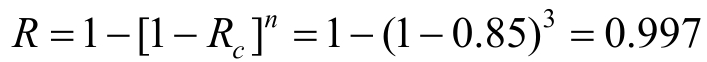 例如,某种地空导弹每发击中敌机的概率R c 为0.85,求连发三发,击中敌机的概率。因为三发导弹击中敌机的概率是相互独立的,任意一发击中敌机就算完成击中敌机的任务,所以三发导弹构成一个并联系统可靠性模式,其击中概率