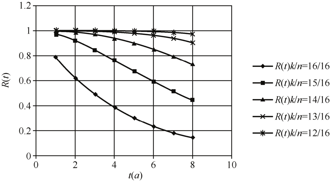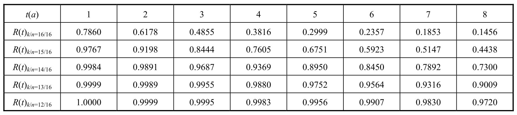 因已知n=16,λ=0.015052/年,故只要确定t和k值后即可利用公式5-35计算得R(t)。计算结果见表5-9和图5-21。