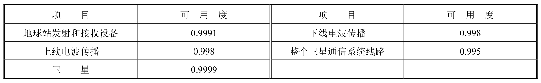 为了给出整星的可用度A,必须估算在卫星使用寿命期间可能出现的一些故障及排除它所需的时间。例如若有一卫星的MTBF=7年,MTTR=6小时,则用上式可计算得其可用度可高达0.9999。此数据相当于前述的美国早期的SBB卫星的设计数据。