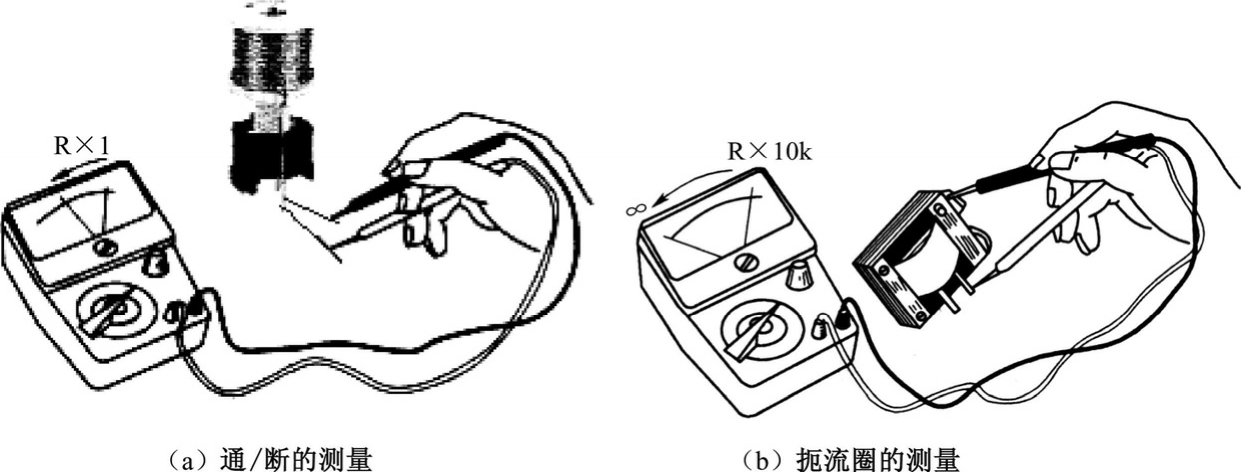 ② 对振荡线圈的检测。由于振荡线圈有底座,在底座下方有引脚,检测时首先弄清各引脚与哪个线圈相连,然后用万用表的 R×1 挡,测一次绕组或二次绕组的电阻值,如有阻值且比较小,一般就认为是正常的。如果电阻值为0则是短路,如果阻值为∞则是断路。