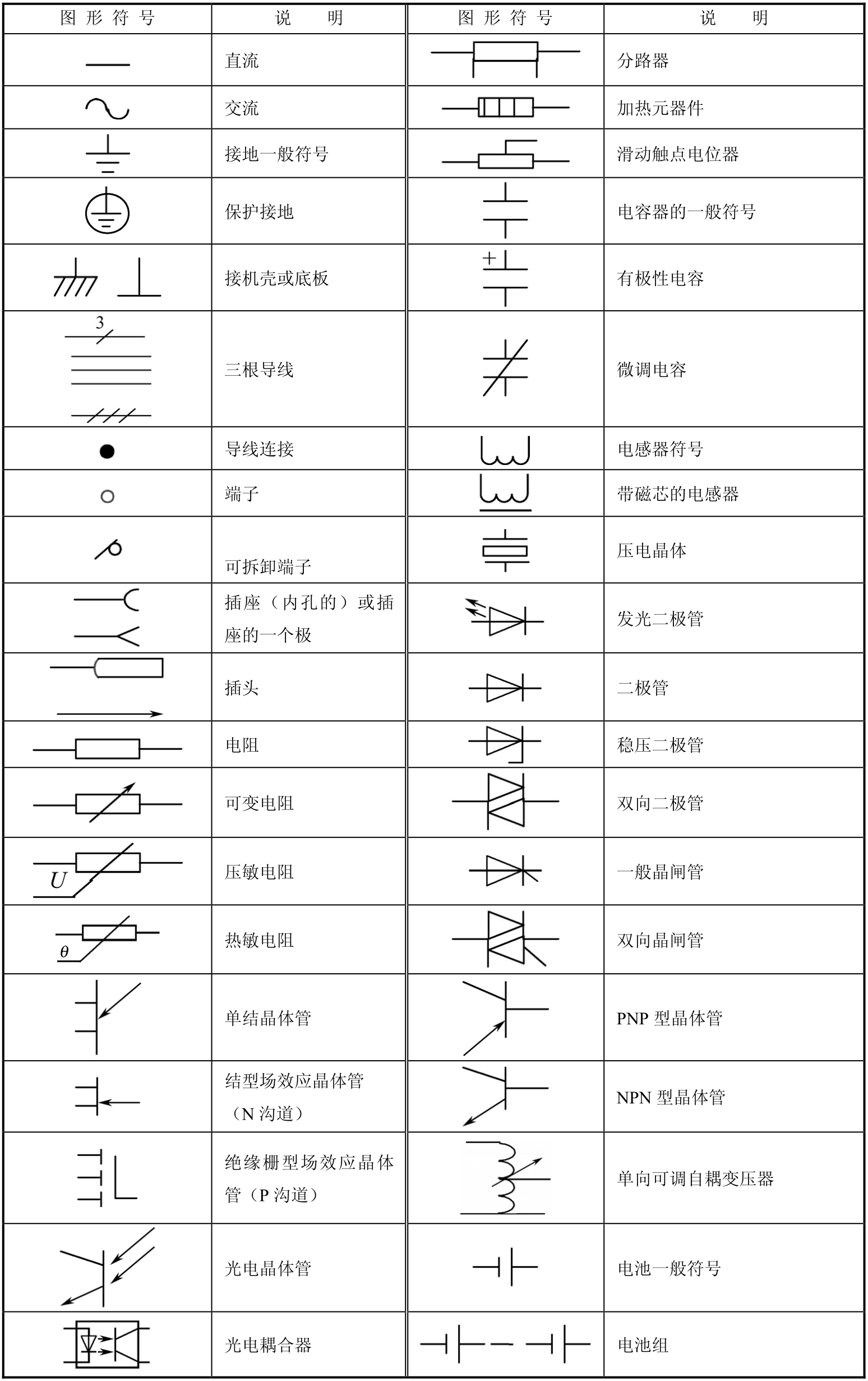 图形符号通常用于图纸和技术文件中,用来表示设备或概念的图形、标记或字符。分为基本符号、一般符号和明细符号。国家标准局对图形符号作了规定,常用的图形符号见表3-3。