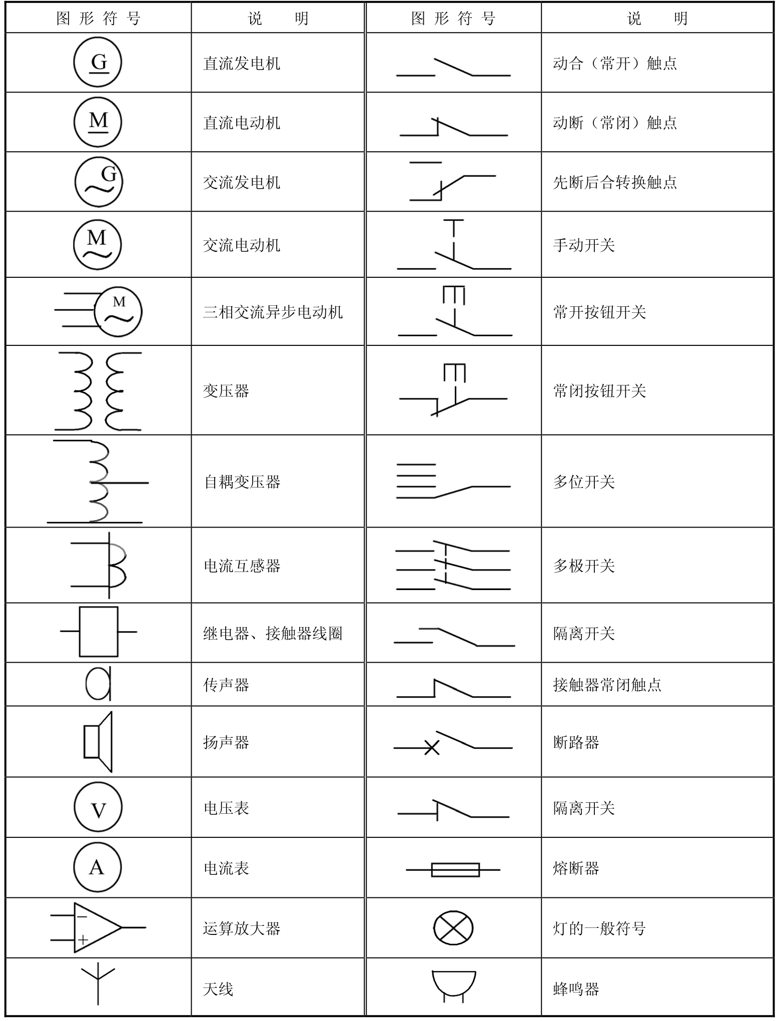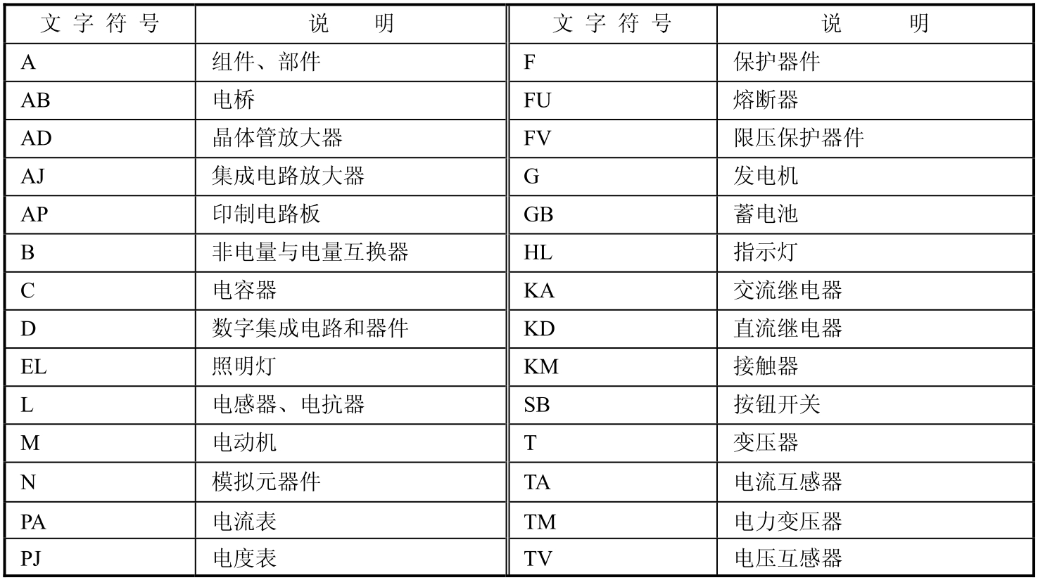 双字母符号是由一个表示种类的单字母符号与另一字母组成,其组合形式以单字母符号在前,另一字母在后的顺序标出。如“RT”表示热敏电阻器,而“R”表示电阻。只是单字母符号不能满足要求时,需进一步划分时,方采用双字母符号,以示区别。在使用多字母符号时,第一个字母按GB/T 7159—1987《电气技术中的文字符号——制订通则》中单字母表示的种类使用,第二个字母可按英文术语缩写而成。基本文字符号不超过两位字母。常用基本文字符号见表3-1。