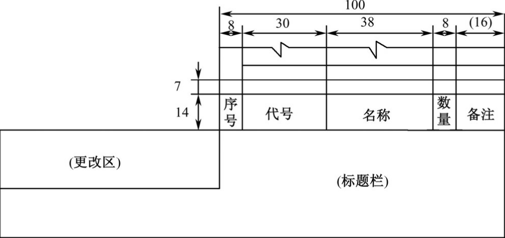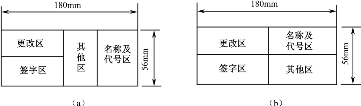 标题栏一般由更改区、签字区、其他区、名称及代号区组成,如图3-2所示,也可按实际需要增加或减少。