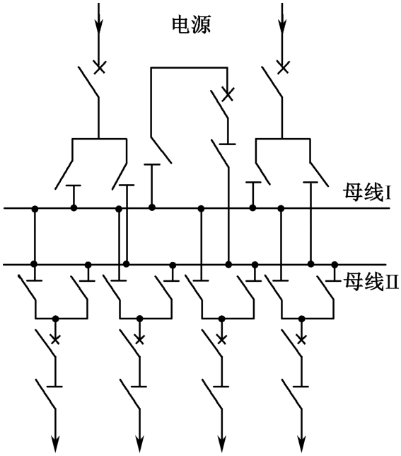双母线主接线,电路如图3-6所示。这种接线方式运行可靠和灵活。两根母线互为备用,当一条母线停电或有故障时,不影响其他线路的正常供电。它适用于供电可靠性要求很高的大型工厂总降压变电所的3.5~10kV的母线系统。电路如图3-6所示,适用于具有二次回路的电源进线、两台变压器终端的工厂总变电所。其特点是有一条跨接的“桥”。