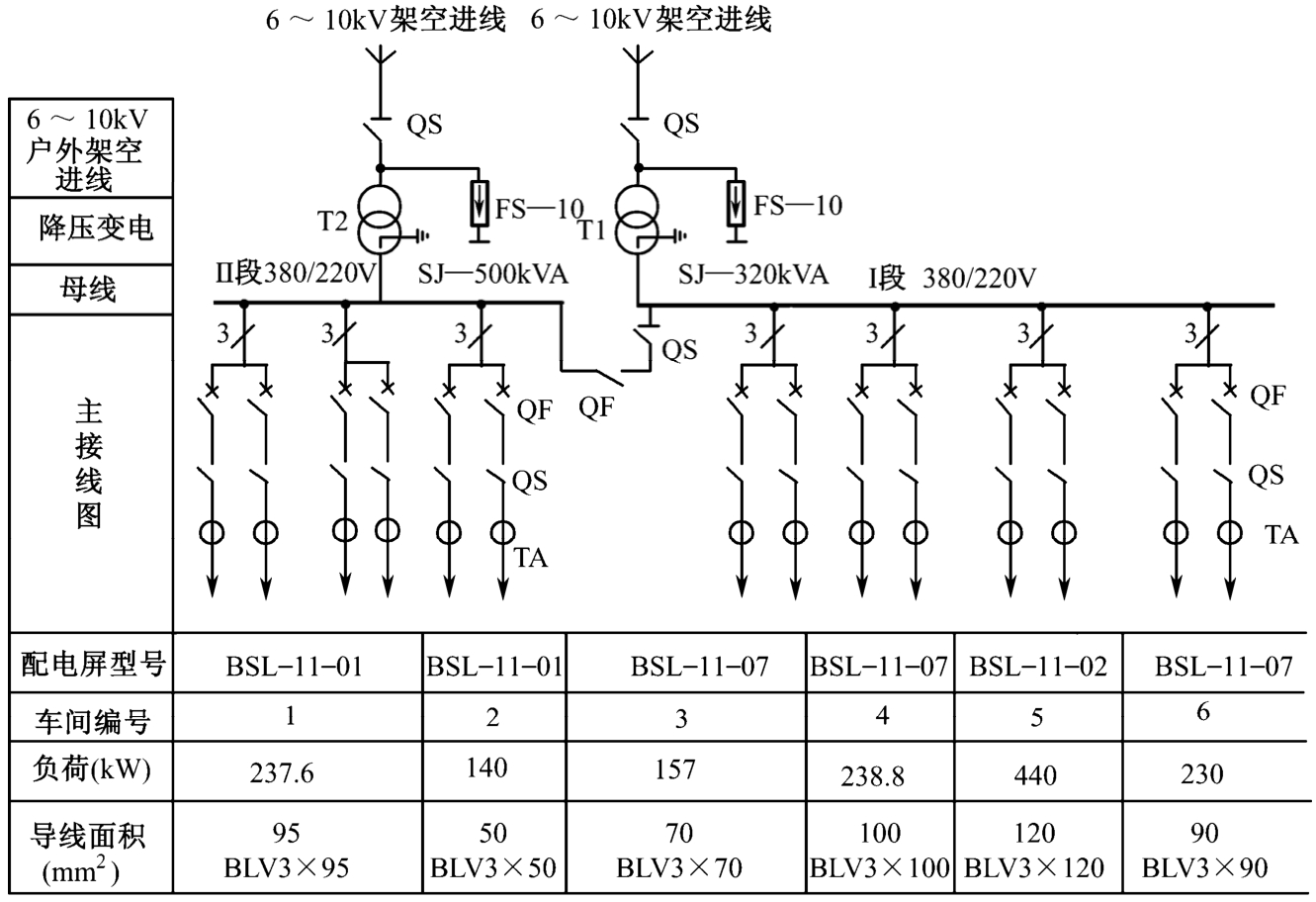 如图3-8所示为某厂变配电系统一次电路图。该方案采用两路电源进线,两台变压器T1(SJ—320KVA)、T2(SJ—500KVA),当任意一台变压器停电检修或出现故障时,可通过另一台供电,用隔离开关QS和断路器QF接通另一段低压侧电路,恢复向负载继续供电。