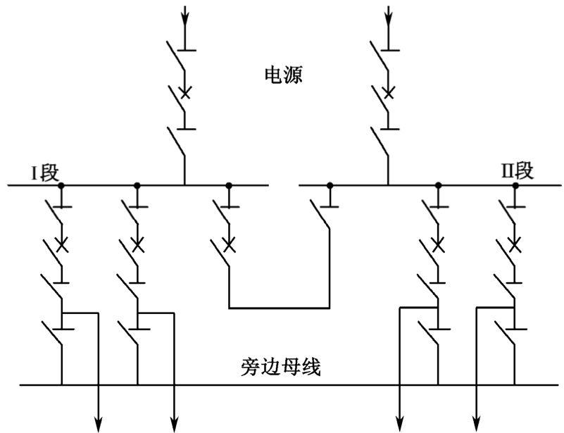 单母线分段带旁路母线式主接线,电路如图3-5所示。其特点是把主母线用断路器分段,且有一旁路母线配合。当检修设备时,可用旁路母线供电,减少停电时间。它适用于配电线路较多、负荷较重的主变电所或高压配电所。
