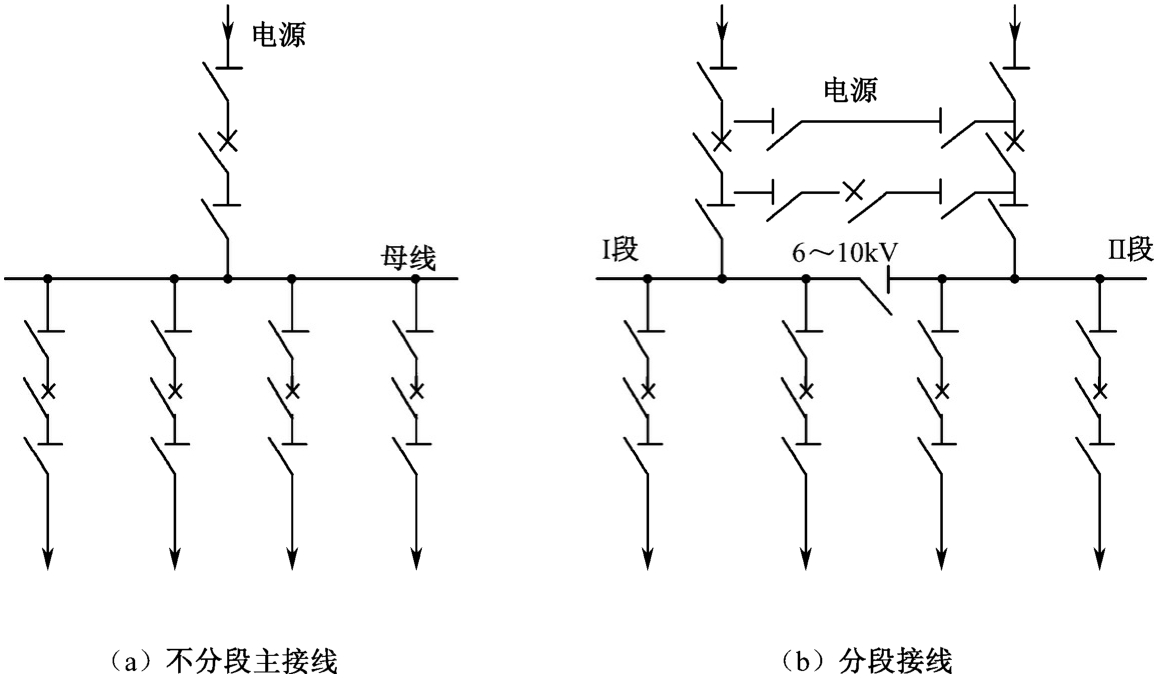 单母线分段式接线,如图3-4(b)所示。其优点是母线或隔离开关发生故障时,负荷可以不要全部切断。可根据电源数目把母线分段运行。