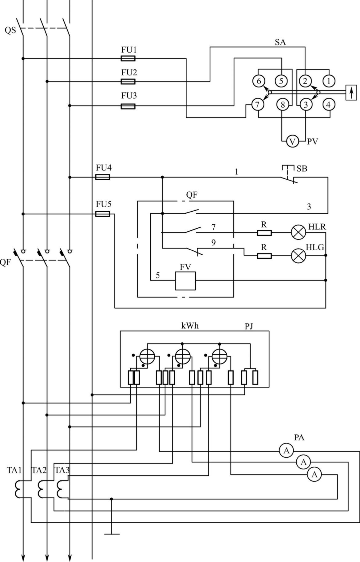 电能计量回路包括一块三相有功电度表PJ和三只电流互感器TA1~TA3及三块电流表PA。利用电度表计量系统用电量情况,利用电流互感器和电流表构成电流测量线路,用以监测线路电流正常与否。