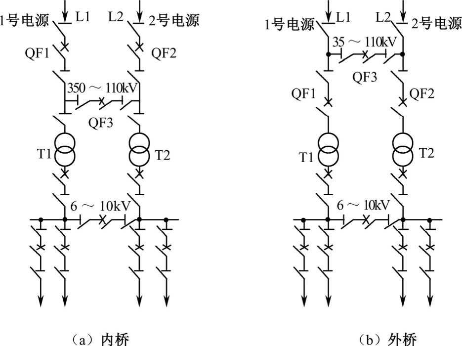 电路如图3-7(b)所示,将跨接桥接在靠近线路侧,使变压器的切除和投入都比较方便。它适用于35kV以上供电线路较短且变压器需要经常操作的系统。