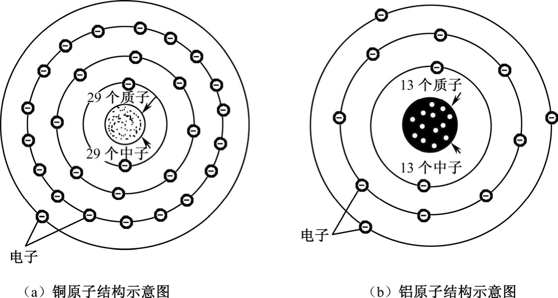 不同的原子,其原子核的质量及其周围的电子数目是不同的。如铜原子和铝原子,它们的原子结构如图1-1所示。铜原子核内有29个带正电的质子,核外有29个带负电的中子。电子呈四层分布,最外层只有一个电子,如图1-1(a)所示。铝原子核内有13个质子,核外有与质子数相等的13个中子,最外层只有一个电子,如图1-1(b)所示。