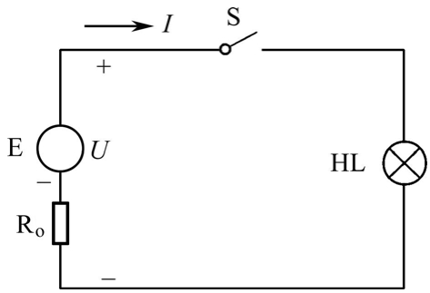 图1-3是图1-2的电路图。电路元件有干电池E、电灯泡HL、开关S和导线。电灯泡HL是电阻元件R;E是电源,内电阻为R o ;连接干电池与电灯泡的中间环节是开关S,其电阻可以忽略不计,认为是一无电阻的理想导体。
