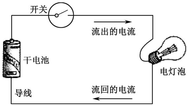 电路是由元器件按一定方式组合而成的。图1-2所示的电路是一个最简单的手电筒实物连接电路,由电源(干电池)、负载(电灯泡)和中间环节(包括连接导线和开关)三部分组成。在电路中,随着电流的流动,进行着不同形式能量之间的转换。