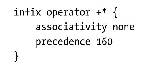 表示要定义的是一个中位操作符,即前后都是输入;其他的修饰子还包括prefix和postfix,不再赘述。