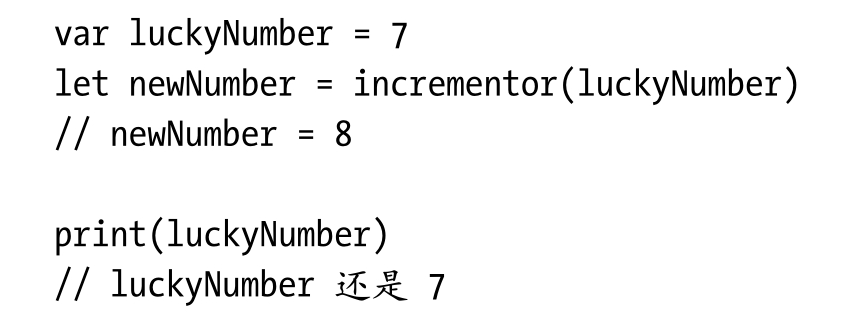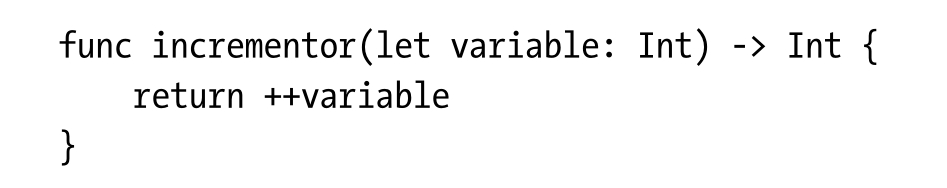 结果发现编译错误。为什么在Swift里这样都不行呢?答案是因为Swift其实是一门“讨厌”变化的语言。所有可能的地方,都被默认为不可变的,也就是用let进行声明的。这样不仅可以确保安全,也能在编译器的性能优化上更有作为。在方法的参数上也是如此,我们不写修饰符的话,默认情况下所有参数都是let的,上面的代码等效为:
