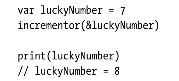 正如上面的例子,我们将参数写作var后,通过调用返回的值是正确的,而luckyNumber还是保持了原来的值。这说明var只是在方法内部起作用,而不会直接影响输入的值。有些时候我们会希望在方法内部 直接 修改输入的值,这时候我们可以使用inout来对参数进行修饰: