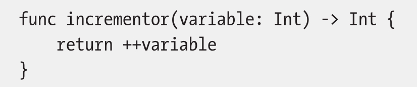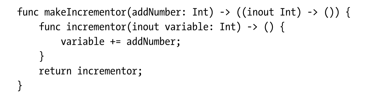 外层的makeIncrementor的返回里也需要在参数的类型前面明确指出修饰词,以符合内部的定义,否则将无法编译通过。