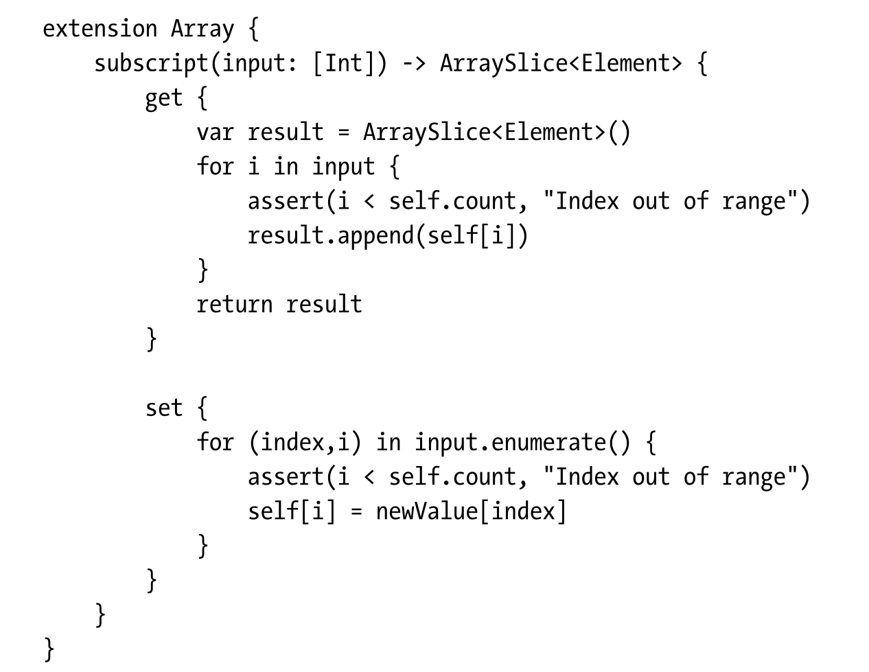 虽然我们在这里实现了下标为数组的版本,但是我并不推荐使用这样的形式。如果阅读过参数列表(见第35页)的读者也许会想为什么在这里我们不使用看起来更优雅的参数列表的方式,也就是subscript(input:Int...)的形式。不论从易用性还是可读性上来说,参数列表的形式会更好。但是存在一个问题,那就是在只有一个输入参数的时候参数列表会导致和现有的定义冲突,有兴趣的读者不妨试试看。当然,我们完全可以使用至少两个参数的的参数列表形式来避免这个冲突,即定义形如subscript(first:Int,second:Int,others:Int...)的下标方法,我想这作为练习留给读者进行尝试会更好。