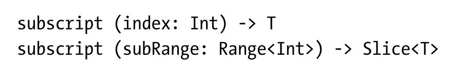 它们共有两种,分别接受单个Int类型的序号和一个表明范围的Range<Int>,作为对应,返回值也分别是单个元素和一组对应输入返回的元素。