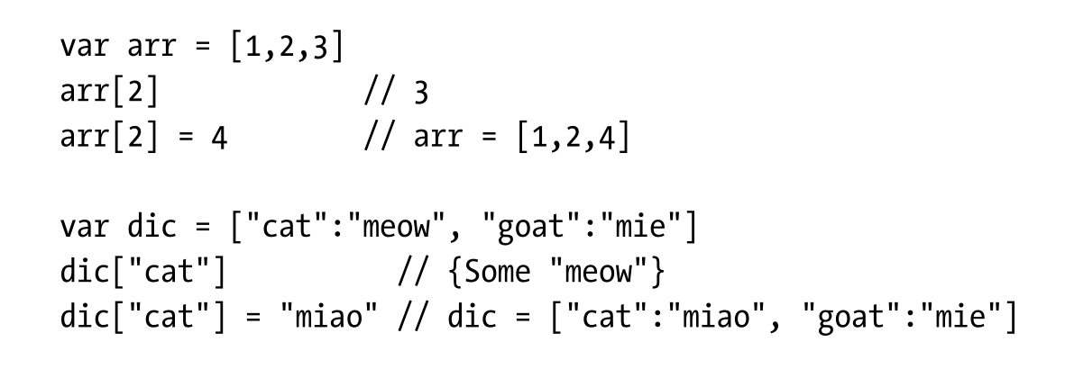 对数组没有什么好说的,但是对字典需要注意,我们通过下标访问得到的结果是一个Optional的值。这是很容易理解的,因为你不能限制下标访问时的输入值,对于数组来说,如果越界了就直接给你“脸色”,让你崩溃,但是对于字典,查询不到是很正常的一件事情。对此,在Swift中我们有更好的处理方式,那就是返回nil告诉你没有你要找的东西。