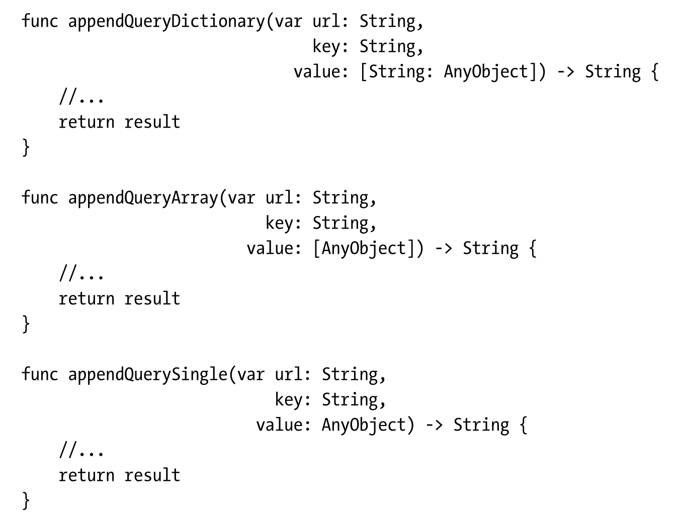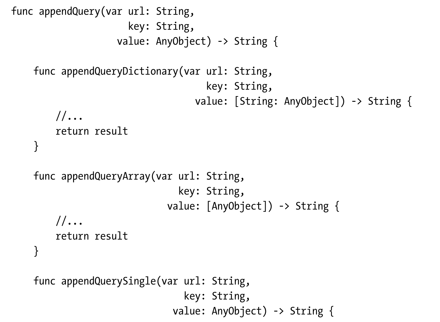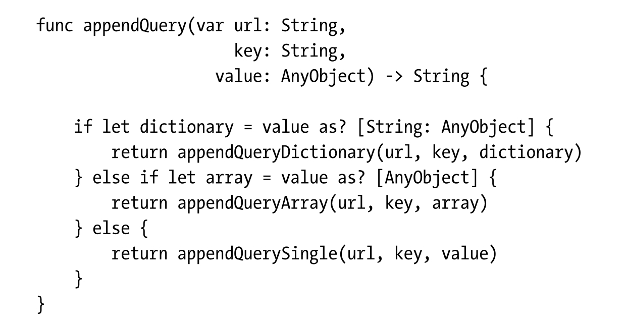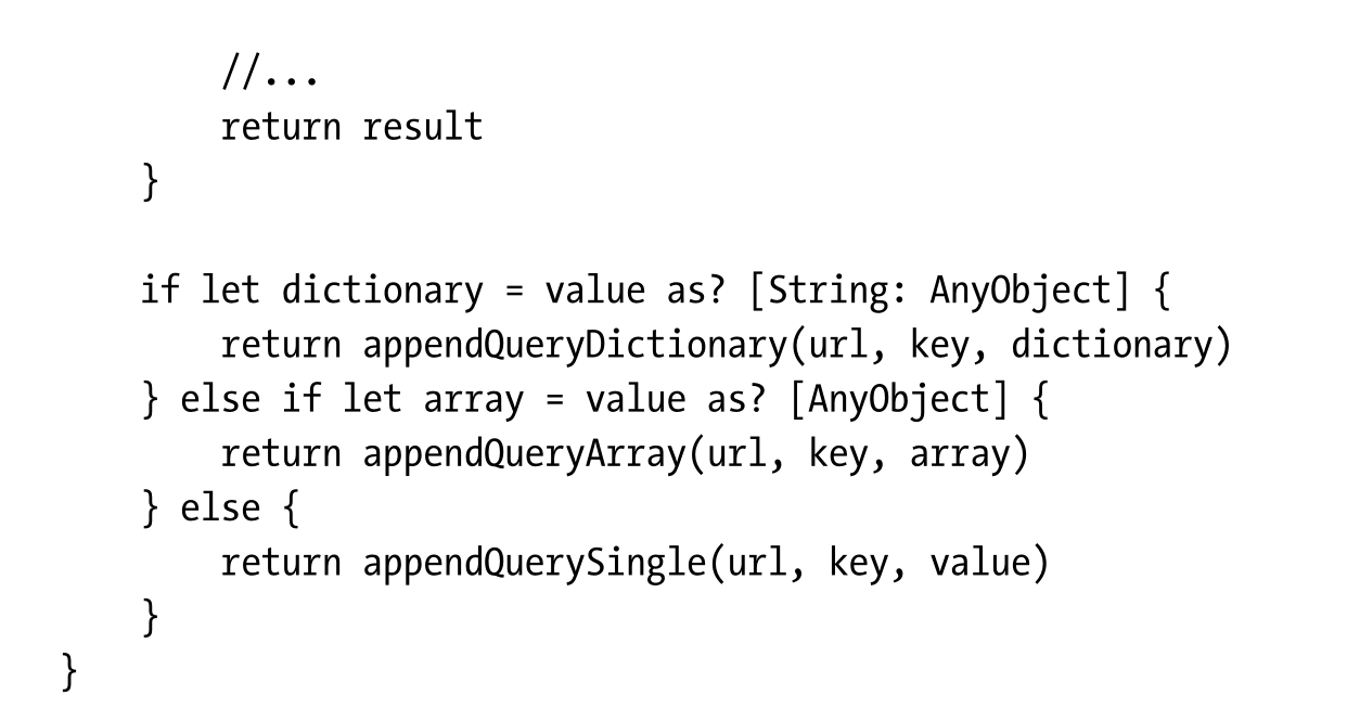 举个例子,我们在写一个网络请求的类Request时,可能面临着将请求的参数编码到url里的任务。因为输入的参数可能包括单个的值、字典或数组,因此为了结构漂亮和保持方法短小,我们可能将几种情况分开,写出这样的代码: