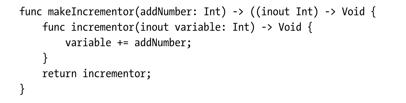 想想看,有多少次我们因为一个方法主体内容过长,而不得不将它重构为好几个小的功能块方法,然后在原来的主体方法中去调用这些小方法?这些具体负责一个个小功能块的方法也许“一辈子”就被调用一次,却不得不存在于整个类型的作用域中。虽然我们会将它们标记为私有方法,但是事实上它们所承担的任务往往和这个类型没有直接关系,而只会在这个类型中的某个方法中被用到。更有甚者,这些小方法也可能比较复杂,我们还想进一步将它们分成更小的模块,有时我们只能将它们放到和其他方法平级的地方。这样一来,本来应该是进深的结构,却被整个展平了,导致了之后在对代码的理解和维护上的问题。在Swift中,对于这种情况有了很好的应对措施,我们可以在方法中定义其他方法,也就是说让方法嵌套起来。