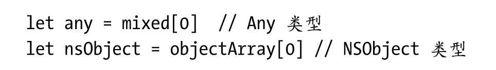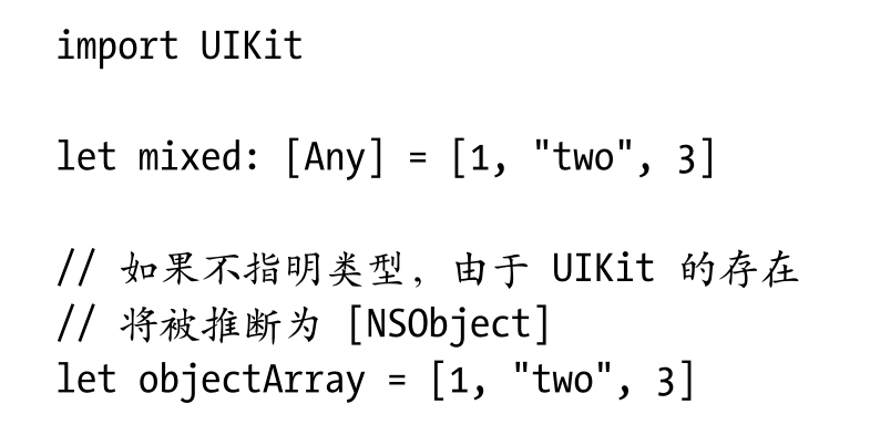 如果我们要把不相关的类型放到同一个容器类型中,比较容易想到的是使用 Any或者AnyObject(见第30页),或者使用NSArray: